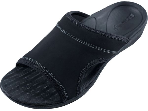 These slides provide the perfect blend of Powerstep's trusted support and stability with a true orthotic footbed to help alleviate pain from Plantar Fasciitis and other common foot conditions. High-quality materials and Powerstep's biomechanically correct contouring offer a premium, supportive shoe in a sleek style. The men's slide features a non-slip tread for better traction, a deep heel cup for added stability, and a lightweight outsole.